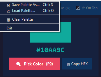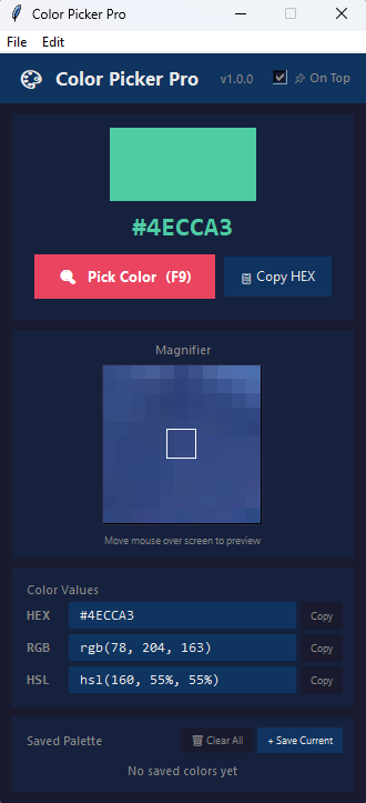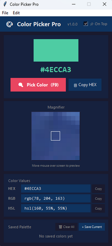 Color Picker Pro is a lightweight, always-on-top color picker for Windows. Click anywhere on your screen to grab any color and instantly get its HEX, RGB, and HSL values — all copyable with one click. Save colors to a persistent palette, export it as a formatted document, and pick up right where you left off next session.