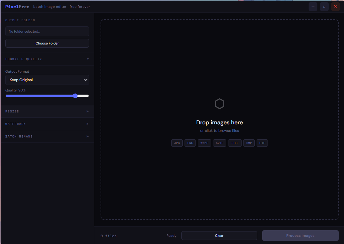 Tired of paying Adobe $23/month just to resize a folder of photos or slap a watermark on your work? PixelFree does it for free, forever, and your images never leave your machine.